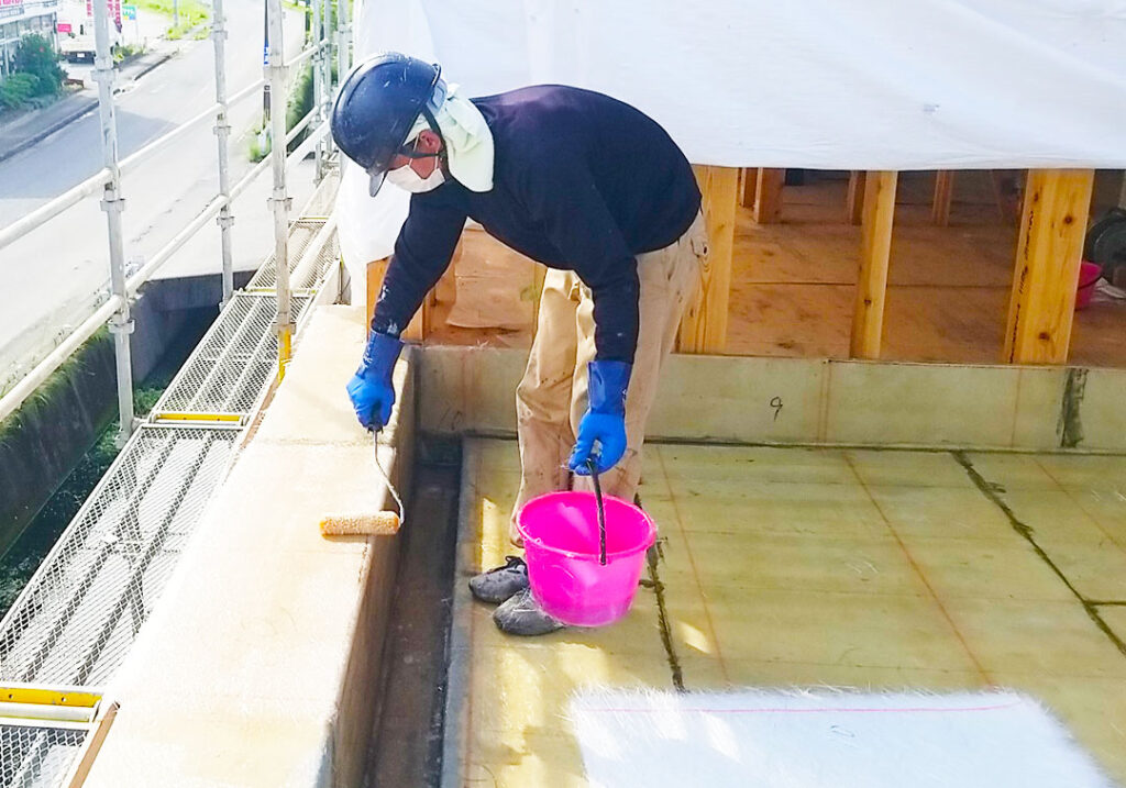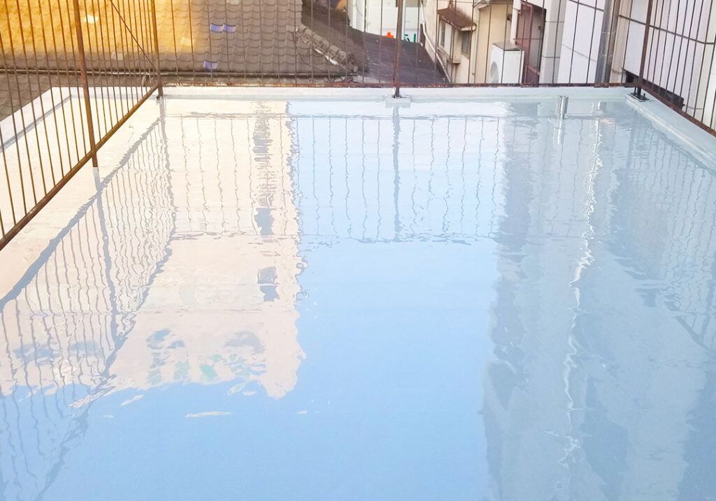屋根やベランダにしてある防水層のことで、雨の侵入を防ぎ空気中の二酸化炭素によるコンクリートの中性化を防ぐ効果があります。ビルやマンションではゴム質のシート防水やウレタン塗膜防水が多いですが、戸建ては殆どがガラス繊維に樹脂を合わせたFRP防水が一般です。外からの雨の侵入を完全に塞ぐのが防水工事です。どんなに見た目が綺麗でも漏水して柱が腐ったり鉄骨が腐食すれば建物は長持ちしません。